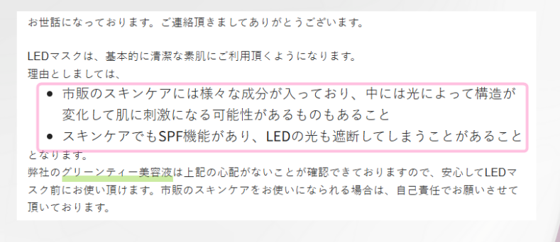 基本的にLEDマスクを使う前は、市販のスキンケアは使わない方がいいとのことです。